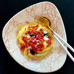Servir les linguines dans chaque assiette, ajouter par- dessus les tomates cerise, les olives noires, râper le parmesan, garnir avec des pétales de fleurs comestibles (fleurs de tagète, fleurs d’ail